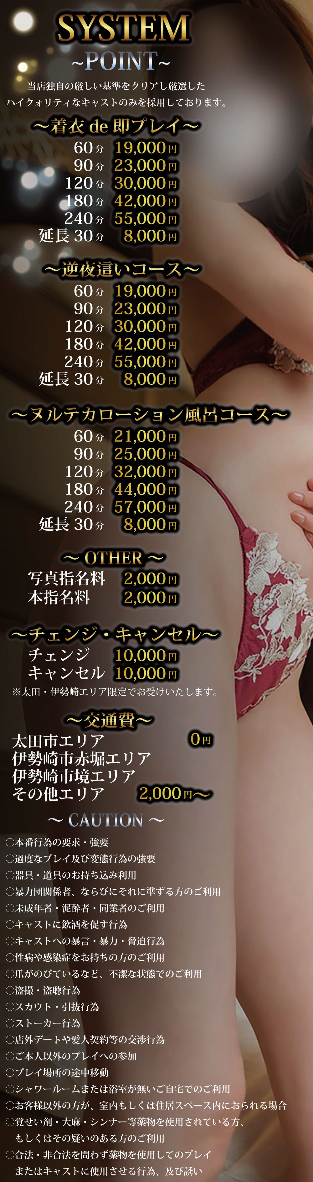 >女性が到着しましたら現金にて料金をお支払い下さい。※24:00を回るプレイ時間の場合は2000円の深夜料金が加算されます。。